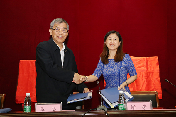 学生处处长强伟纲主持仪式、华坚副校长与欧司朗(中国)照明有限公司运营总监谢芳女士代表双方签订合作协议,并为双方合作共建的综合性校外实践教学基地和人才培养教育中心揭牌。