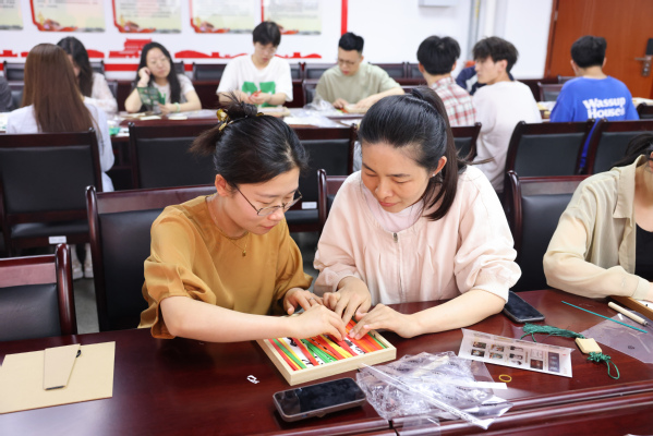 随后,国家级非物质文化遗产项目(无锡留青竹刻)省级代表性传承人乔瑜老师为全体师生详细讲解了“留青竹刻”的历史,并教大家动手制作竹刻作品。从最基本的刻刀握法教起,为大家一一阐述圈边、铲底等环节的做法。留青竹刻需经选材、构图、切边、铲底、清底、上油、晾晒七道工序,才会有一副成品呈现,留青竹刻刻的是耐心、刻的是定心,刻的是坚韧不拔的精神。体验完留青竹刻,师生们又一起体验了非遗竹编画的制作。“压二挑二,挑二压二”,侨胞代表中的一位老阿姨亲切地教大家怎么编竹编画,竹篾在师生手中一抬一压,相互缠绕,手指一抬一压之间,彰显传统工艺的魅力,精湛的竹艺,匠心思维的传承,更是传统竹编艺术的魅力绽放。师生耐心制作,一件件精美的作品在欢笑中诞生。