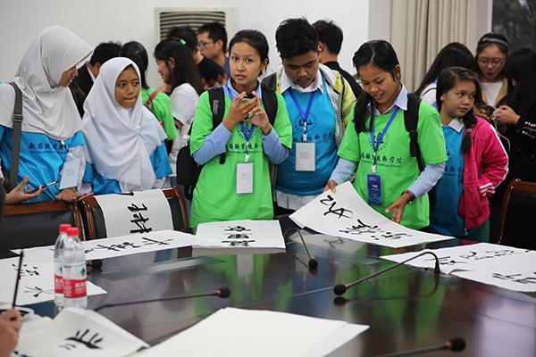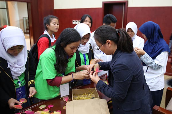 除了文艺表演,我校还为代表团安排了互动交流,图书馆老师手工制作的丝网花,学生社团的太极、书法和古筝都引起了来访青年们极大的兴趣,纷纷加入其中,体验中华文化的独特魅力。