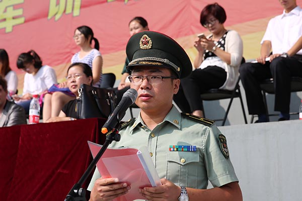 承训部队解放军73031部队首长吴茂林少校在讲话中回顾了多年来承接我校军训任务的相关情况,勉励同学们珍惜时光,以全新的精神面貌迎接大学的第一堂课——军训,并要求全体教官遵章守纪、科学施训。