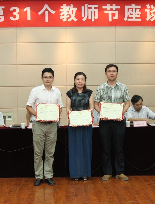 随后,校领导为获表彰教师颁发了荣誉证书;龚方红校长为辛勤从教三十年的教师佩戴绶带。郭琼、俞张勇、外教Dave三位教师代表,结合自身工作和生活实际,畅谈了对学校跨越式发展的所见、所闻、所感,表达了身为教师的自豪感与责任感,回顾了在教育、教学工作中的体会和感悟,针对学校的学科专业建设、科研激励政策、优化师资队伍建设、建章立制规范教学管理等方面提出了宝贵的意见和建议,学生代表苑威信同学也向全体教师表达了感谢和节日的祝福。