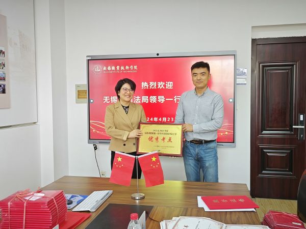 4月23日,无锡市司法局副局长魏晓晗一行到访我校,代表无锡市国家统一法律职业资格考试工作领导小组向我校授牌“2022至2023年度无锡市国家统一法律职业资格考试工作‘优秀考点’和‘先进集体’”。我校荣获优秀考点,物联网工程学院荣获先进集体,曹冬美等10人荣获优秀考务工作者,薛幸龙等18人荣获优秀志愿者。
