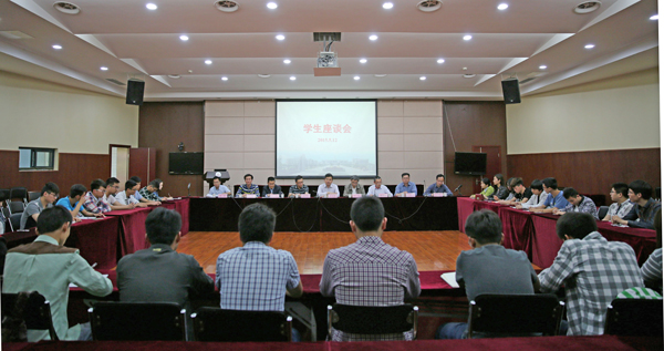 为进一步转变工作作风,狠抓内涵建设,服务全体学生,5月12日下午,我校在国际交流中心二楼报告厅召开学生座谈会,听学生心声,答学生提问,解学生困惑。校领导朱爱胜、华坚,校办、学生处、教务处、保卫处、后勤处、后勤服务总公司和团委等职能部门有关同志参加了座谈会。