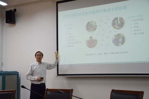 冯渊副校长致欢迎词时表示,希望双方在原有合作基础上进一步加强交流。刘全胜院长介绍了物联网技术学院的发展现状,展望了今后同思科公司进行国际合作办学的前景。肖颖老师介绍我校思科网络学院发展情况。奚祖强先生运用视频等多媒体生动地介绍了思科公司所提出的万物互联的概念以及发展趋势。双方在回顾了思科公司与我校计算机网络技术专业共建思科网络技术学院的成功合作经历后,提出了进一步加强在物联网应用技术专业建设中的合作事项,包括国家物联网应用技术专业教学资源库建设、申报物联网应用技术专业江苏高校品牌专业建设工程、物联网应用示范展示项目建设等方面。刘晨处长也介绍了目前无锡市物联网产业的现状,对我校及思科公司的合作表示高度认可并提出了具体的要求和希望。