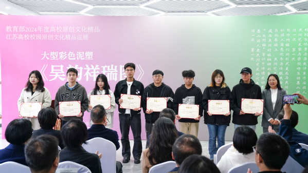 4月8日上午,教育部2024年高校校园原创文化精品《吴韵祥瑞图》大型彩色泥塑江苏高校校园巡展在我校绎江南文化传承创新基地启动,在锡高校师生1000多人次到场参观。