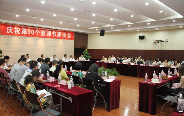 在第30个教师节来临之际,我校于9月9日下午在国际交流中心二楼报告厅召开座谈会,校领导朱爱胜、谈向群、华坚、顾京,工会、人事处、组织部等相关部门和院系负责人,教授博士代表、获表彰的优秀教师及优秀教育工作者、学生代表60余人参加了座谈。