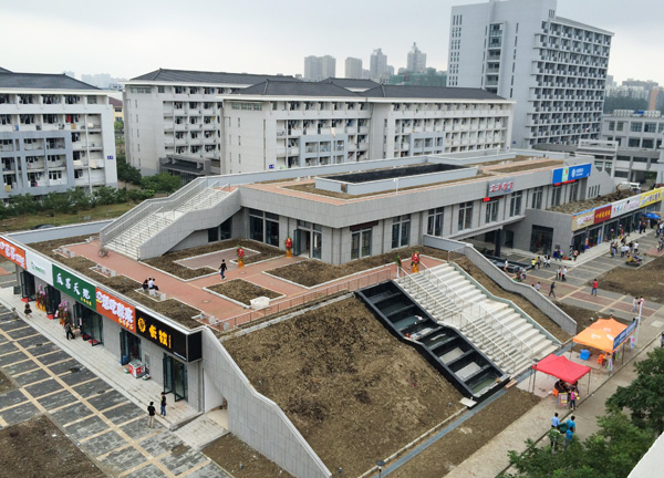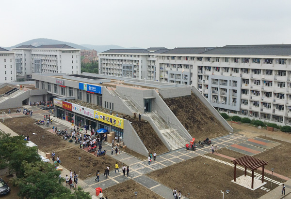 学生生活广场项目是学校党委践行“十二五规划”中提出的努力把我校建设成为“企业的伙伴、学生的家园”目标而打造的提高学生后勤服务能力的项目。该项目位于学生宿舍区中央,采用“生态校园”的设计理念,结合建筑本身与硬质铺装、集中绿化及屋顶绿化为核心的景观设计原则,打造“隆起的草坡”。建筑风格现代、简约。学生生活广场充分发挥了校园特有的自然条件,在满足提供学生室外活动、集会、自由交流的空间前提下,还提供了学生在校生活期间的各类便利服务场所。