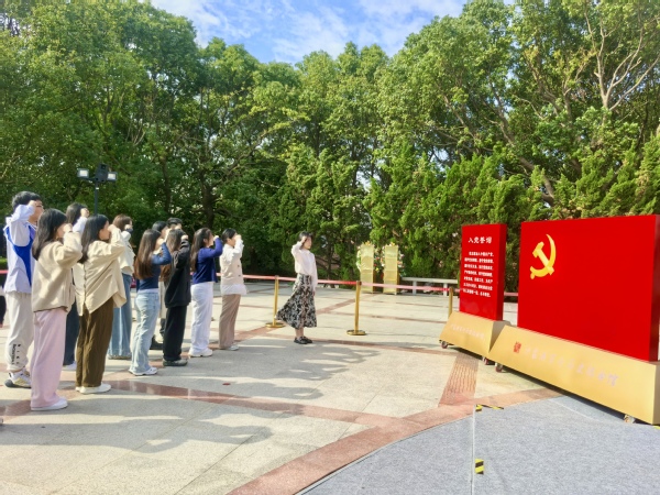 在沙家浜革命历史纪念馆广场,师生党员佩戴好党员徽章,面对鲜红的党旗,庄严举起右拳,郑重宣誓:“我志愿加入中国共产党,……为共产主义事业奋斗终身,永不叛党”,一字一句铿锵有力,用发自内心的声音表达了永远听党话、跟党走的坚定决心,立下了为党的事业奋斗终身的誓约。