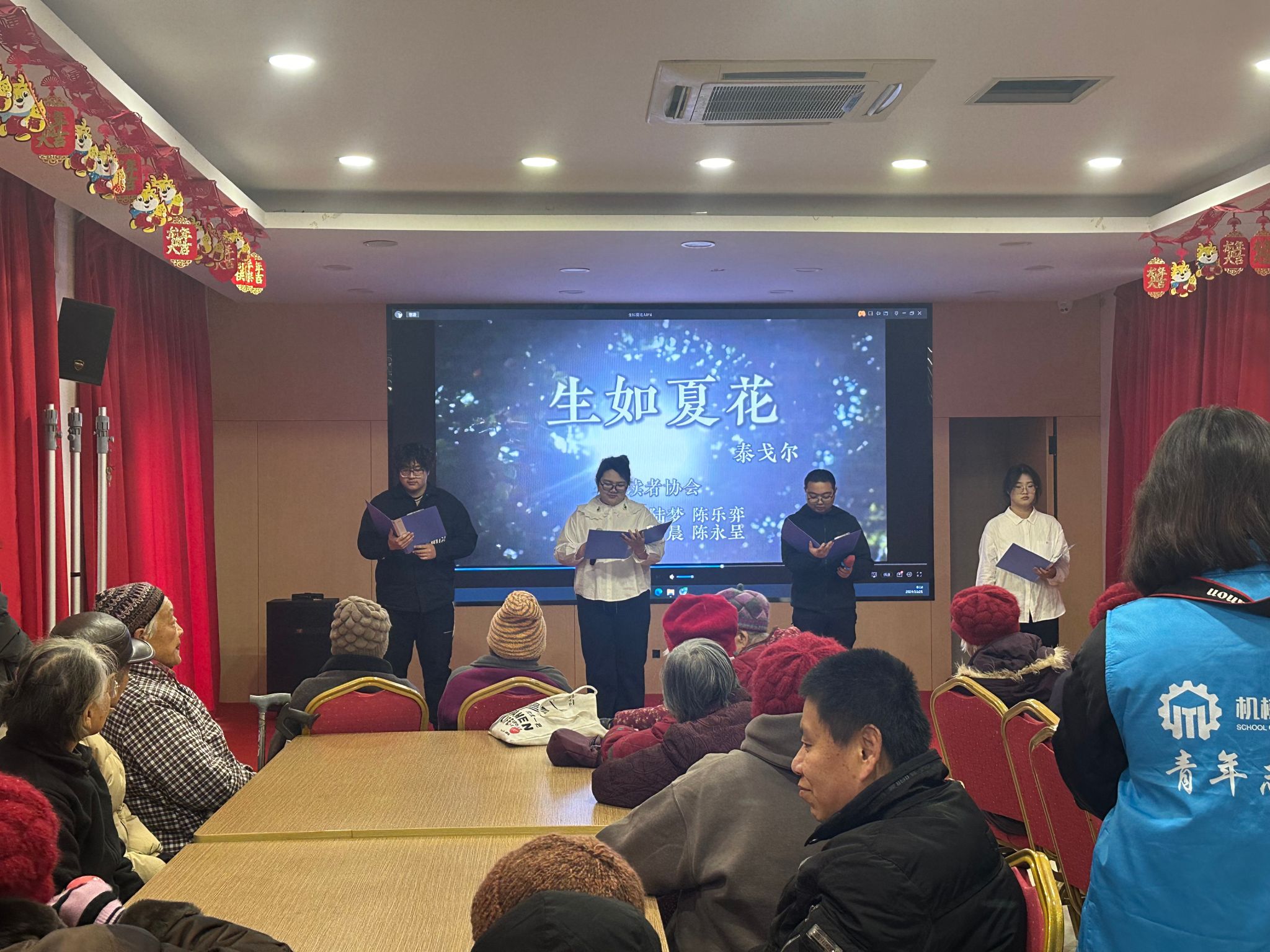 活动当日,志愿者们带着满满的爱心来到了幸福颐养院,陪伴老人度过一个暖心愉快的冬至。志愿者们为老人精心准备了一系列表演及互动节目,有诗朗诵《生如夏花》、太极表演、剑术表演和《紫荆花》大合唱。其中诗朗诵《生如夏花》是对壮丽岁月的诗意礼赞,是对生命热烈绽放的歌颂,正如中华人民共和国七十五载里,无数先辈与人民以饱满热情、无畏勇气,在时代浪潮中尽情挥洒光热,让生命如夏花般璀璨,在国家发展的长卷上留下浓墨重彩且永不凋零的篇章,激励我们继续以昂扬之姿为祖国的未来奋勇前行。活动现场充满了欢声笑语,温馨的氛围让每个人都感受到了“岁月静好,现世安稳”的美好。