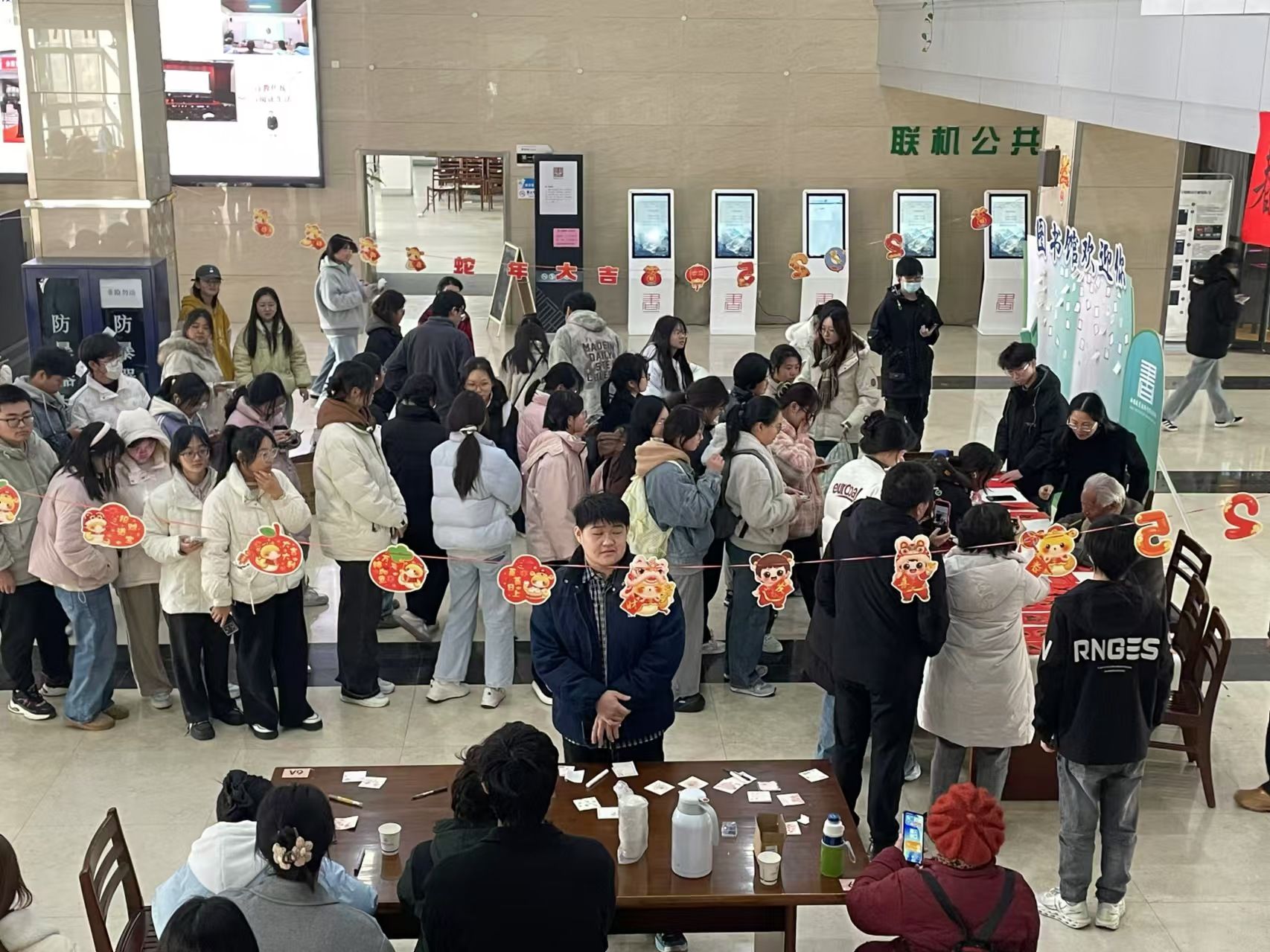 活动伊始,挂满喜庆装饰的图书馆大厅即吸引了很多同学在馆内排起长队,选择自己心仪的春联。陆涛清老先生挥毫泼墨,一幅幅春联和一个个福字随即展现在师生面前。现场气氛热烈而温馨,师生们围绕在旁边,热切关注这位老先生的创作,感受着中国传统文化的魅力和节日的气氛。手持春联福字,师生们纷纷表示,这样的活动不仅让他们感受到了节日的温暖,也对中国传统文化有了更深的认识和感受。除了春联和福字的赠送,现场还设置了“变魔术”等游戏环节,更增添了现场的互动氛围。