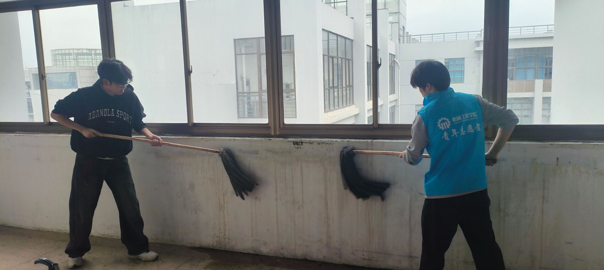 与此同时,负责楼宇清扫的志愿者们也干得热火朝天。他们手持扫帚、拖把、抹布、清洁剂等工具,对各楼宇的走廊、楼梯、扶手、公共卫生间等区域进行了全面清扫。志愿者们分工明确、认真细致,不放过任何一个卫生死角,将地面上的污渍、墙壁上的灰尘、窗台上的杂物都清理整洁。在打扫过程中,志愿者们发扬不怕脏、不怕累的精神,有的弯腰捡拾地上的垃圾,有的踮起脚尖擦拭高处的灰尘,有的蹲下身子清理角落的污垢。他们忙碌的身影,成为了学院里一道亮丽的风景线。值得一提的是,面对学院墙面上密密麻麻的标记和涂鸦,志愿者们用砂纸一点点地打磨和用白漆擦拭,耐心地将墙面恢复如初。在清扫过程中,志愿者们还积极向同学们宣传保持校园环境卫生的重要性,倡导大家养成良好的卫生习惯,共同维护校园的整洁美观。