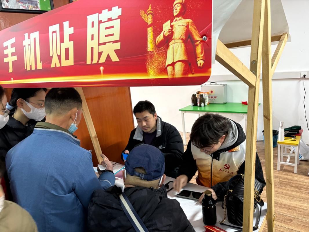 志愿者们发挥动手能力,为居民提供免费手机贴膜、电子设备清洁等服务。贴膜摊位前,志愿者细心询问需求,用专业工具精准操作,赢得居民连连称赞。同学们纷纷表示“用专业服务社会,用热情温暖他人,这就是新时代青年的责任”。