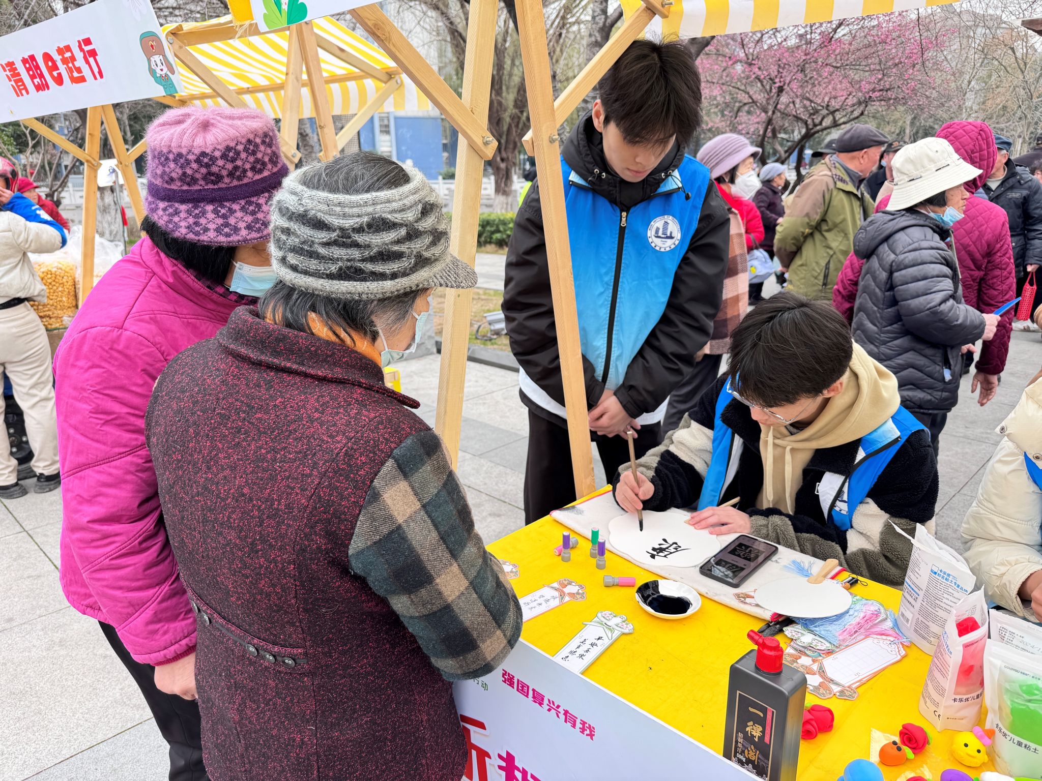 公益市集上,砺香义工站的志愿者们开展了一场别具一格的黏土创意手工活动,吸引了社区多名小朋友参与,大家在欢声笑语中体验了黏土创作的乐趣。与此同时,会书法的志愿者还铺上毛毡,挥洒自如地书写着寓意美好的书签和团扇,为社区居民们送上真挚的祝愿,不一会儿便被领取一空。本次活动不仅让居民们感受到了手工制作的乐趣和传统文化的魅力,更让大家在实践中体会到了互助与友爱的力量,为这个春日增添了一份温暖与美好。