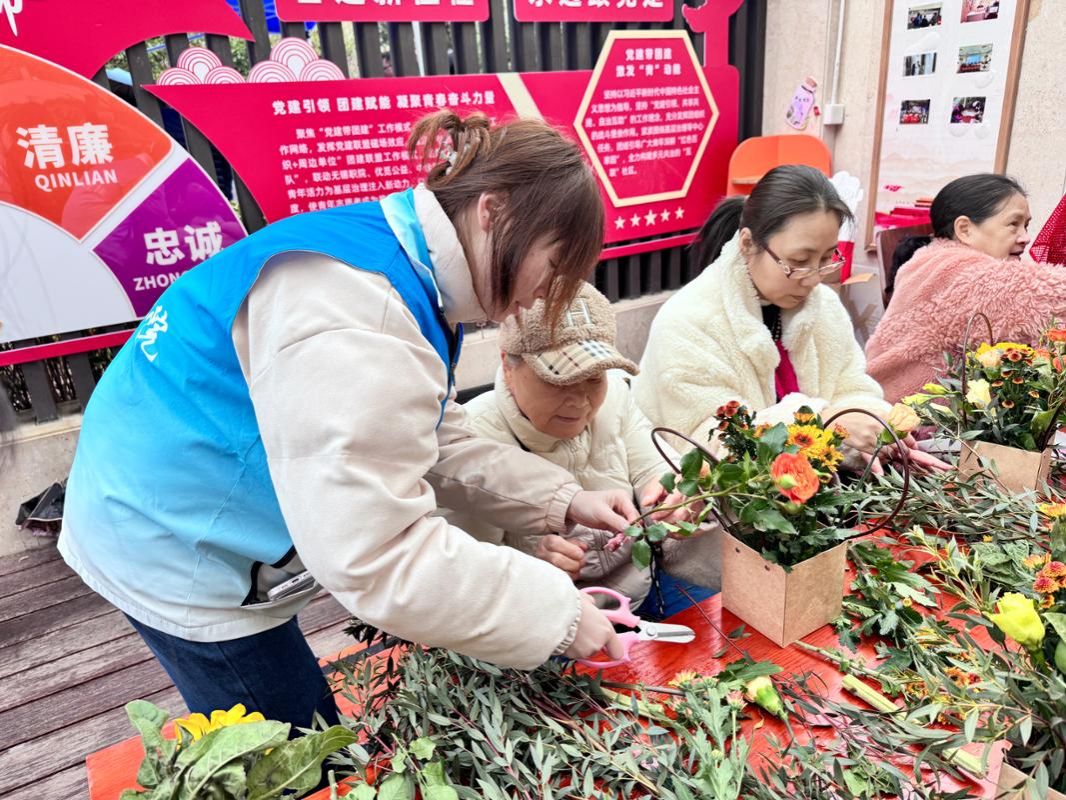 插花过程中,老人们相互交流、相互学习,分享着自己的经验和心得。青年志愿者们也积极参与其中,与老人们亲切交谈,为他们提供帮助和指导。通过与年轻人的交流,老人们不仅学到了新的插花技巧,还感受到了年轻人的热情和关爱。这种代际之间的互动,让老人们感受到了社会的温暖和关怀,也让青年志愿者以实际行动传承雷锋精神。