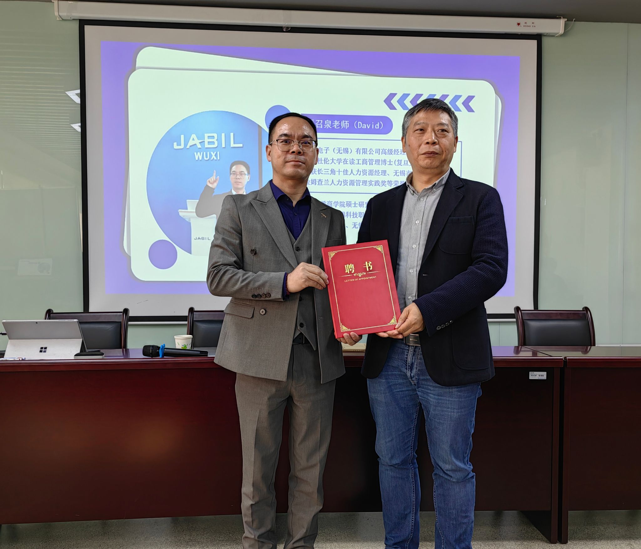 讲座前,控制工程学院党总支书记曹秀中为潘召泉颁发了校外职业导师聘书。潘召泉结合捷普电子的实践经验指出,当前制造业正加速向数字化、智能化转型,企业对人才的需求已从单一技能转向“技术+管理”的复合型能力。针对学生规划意识薄弱的问题,他提出“三步走”策略:一是通过职业测评工具明确个人优势与兴趣;二是结合企业需求制定分阶段目标;三是借助校企资源建立职业网络。捷普电子近年来通过“项目式”实习与南航等学校合作,让学生在产线优化、智能仓储等真实课题中提升能力,多名实习生因表现优异直接录用。控制工程学院党总支副书记周嫄表示,学院将持续深化与捷普电子等优秀企业的合作,助力学生实现从“校园人”到职业人的无缝衔接。