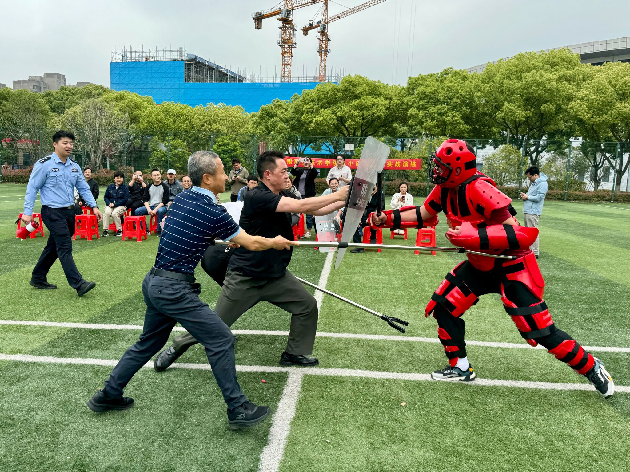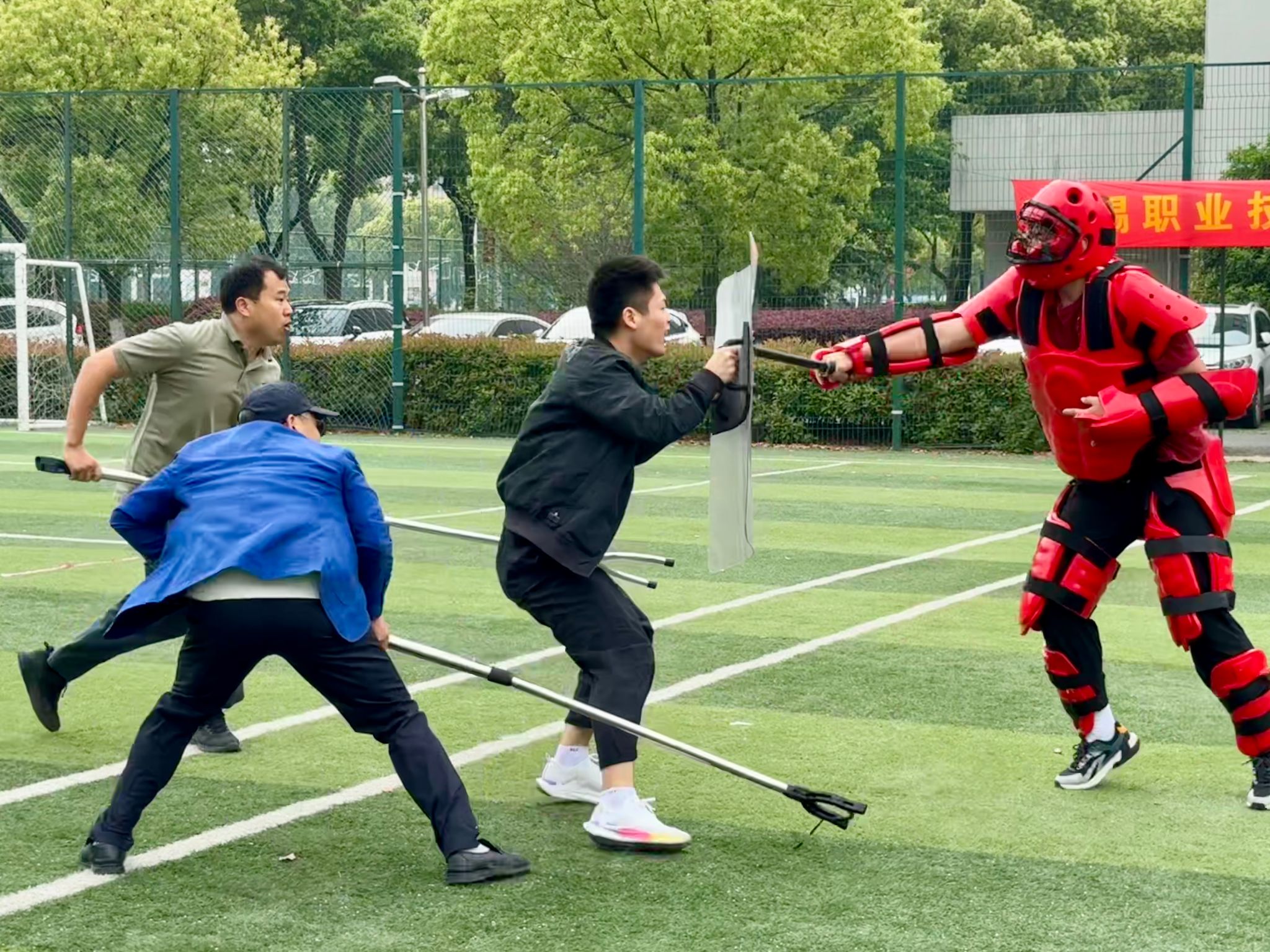 演练伊始,张绪韬警官围绕最小应急单元的职责、处置流程及协作要点展开专题培训。系统讲解突发事件处置流程、战术协作要点及安全警戒规范。并通过案例分析了校园常见安全风险的应对策略,重点演示了防暴盾牌、钢叉的攻防技巧,人员疏散要领及报警联络机制。他强调,3人作战单元需形成“三角战术队形”,要熟练掌握突发事件的前期处置技能,确保攻守兼备。