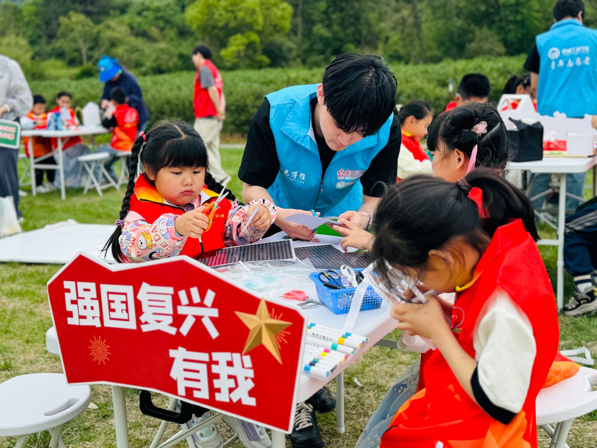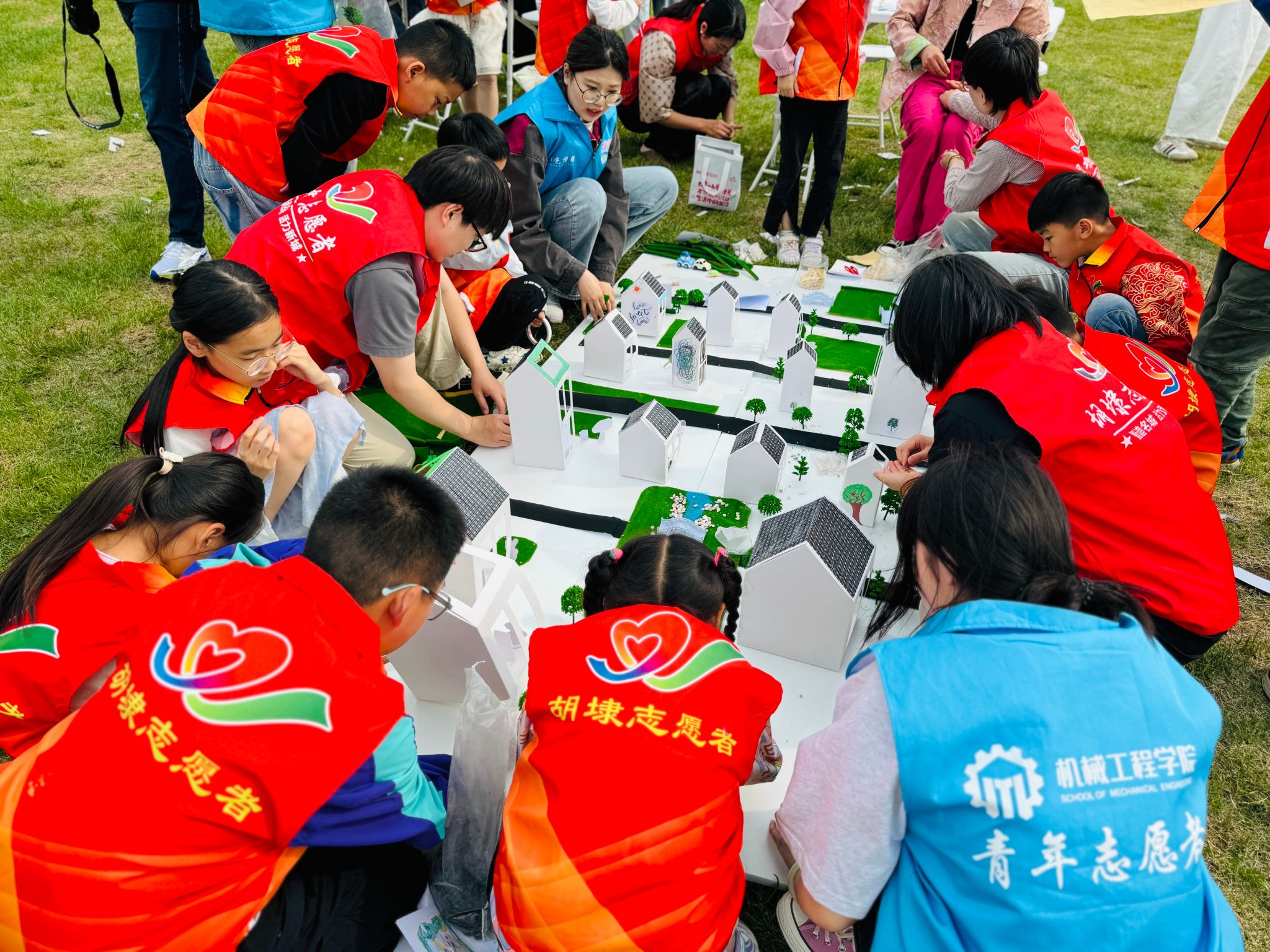 在实践环节中,志愿者们以“传统与现代共生”为理念,指导孩子们完成中湾村微缩景观模型的沉浸式建构。从传统砖瓦榫卯工艺的还原,到光伏板与生态沟渠的智能化集成,志愿者通过草图绘制与实体搭建的递进式探索,将绿色理念与创新逻辑融入乡村场景构建之中,培养了孩子们的创新思维与动手能力,又让乡村文化与生态智慧得以生动传承。