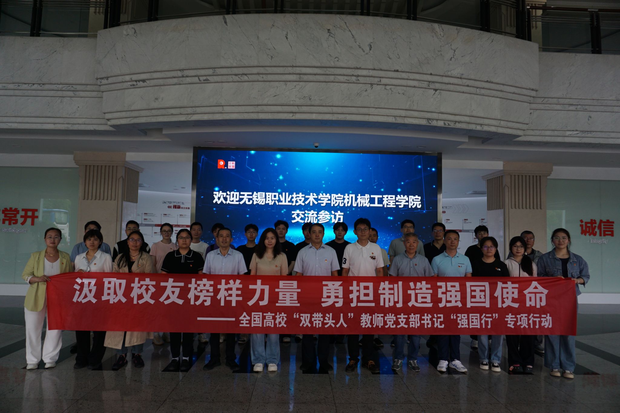 随后,师生党员来到校友企业常熟开关制造有限公司,公司党委副书记、工会主席周玉明;市场管理部部长、优秀校友戴建定热情接待。在企业技术人员的带领下,师生党员参观了智能生产线,了解智能制造在低压电器生产中的应用与创新。周玉明介绍了公司目前发展情况,表示常熟开关不断发展壮大,离不开他们的“心诚”党建工作法,即对党忠诚、对事精诚、对人真诚。结合专业特色,全国高校“双带头人”教师党支部书记“强国行”专项行动团队领衔人苗盈博士及团队师生党员围绕机械加工精度提升、自动化设备优化等问题与企业技术人员展开热烈交流。