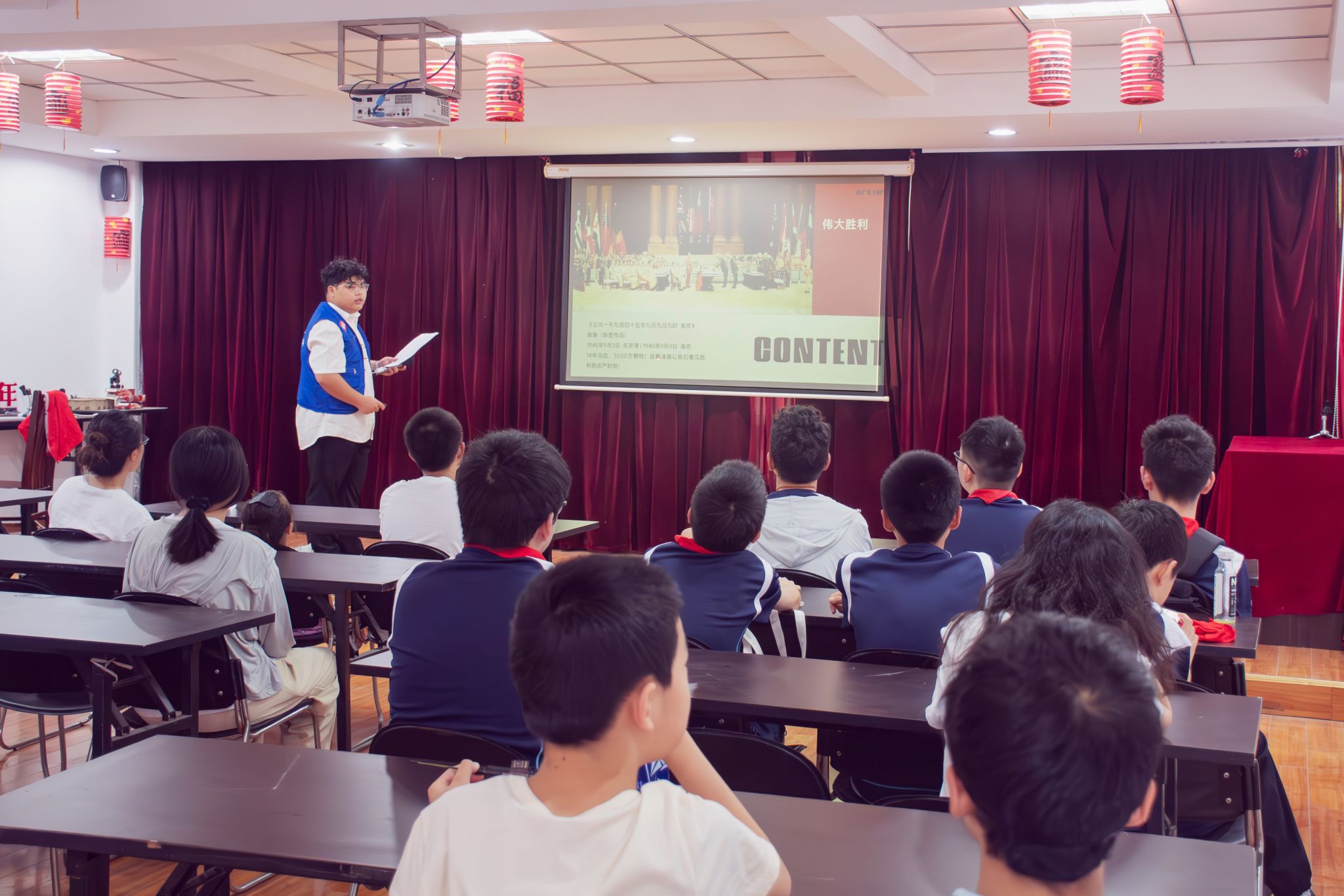“今天是一个特殊的日子。”陶俊凯同学作为主讲人,将“七七事变”的始末细细道来,“从浴血奋战到建立新中国,无数英勇无畏的革命先辈为之付出了生命。”他借《七七事变・卢沟桥》《怒吼吧,中国》等经典画作,串起从抗战烽火到开国大典的历史脉络,让孩子们在艺术视角中触摸民族记忆。随后,现场播放了纪念抗战胜利70周年阅兵式的盛况,孩子们也纷纷说出“山东舰”“东风系列导弹”“歼-20”等大国重器,大家都感受到党的十八大以来,中国科技飞速进步,带来国防实力的硬核提升。