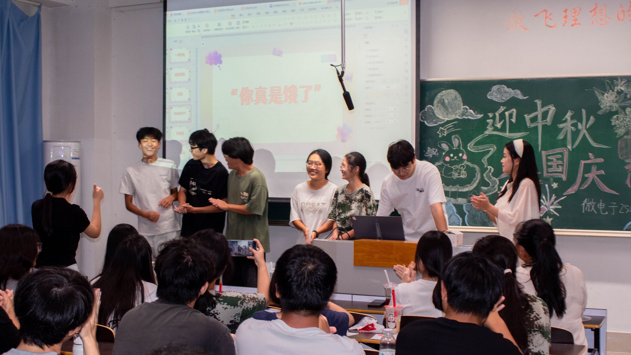 活动内容集趣味性、文化性与专业性于一体,现场气氛热烈,精彩纷呈。在趣味游戏区,“那当然啦”“人类演技大赏”“你画我猜”等互动游戏吸引了同学们的踊跃参与。现场欢声笑语不断,同学们在轻松愉快的互动中迅速拉近距离,有效增强了班级凝聚力,培养了团队协作精神。游戏间隙,新生们纷纷主动登台,展示了歌曲、舞蹈等精彩才艺,充分展现了我院学子多才多艺、朝气蓬勃的青春风采。由2025级13个班级精心设计的中秋主题板报成为一道亮丽的风景线。各班板报创意独特,既有“玉兔赏月”等传统元素的诗意呈现,更不乏专业特色的巧妙融合。部分班级将芯片电路与明月玉兔同绘,配以“芯系家国,情满中秋”等主题寄语,展现了同学们的专业认同与家国情怀,体现了“芯”时代青年的精神风貌。来自集成电路25322班的萨仁娜同学在活动后激动地表示:“虽然这是第一次离家过中秋,但学院的晚会让我感受到了家一般的温暖。精彩的游戏让我结识了新朋友,也对新集体有了更深的归属感。”