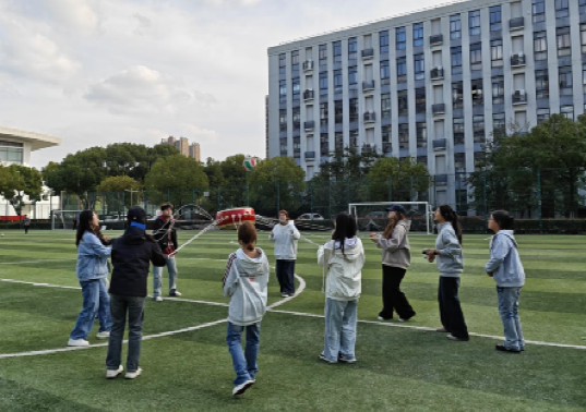 在随后的心理素质拓展环节,师生共同参与了“同心鼓颠球”和“摸砖过河”两项团队协作游戏。“同心鼓颠球”活动中,每组队员手拉系于鼓侧的绳索,通过默契配合不断将球颠起。随着鼓点声声,球影起落,大家的心也紧紧相连。“摸砖过河”是一场智慧与协作的双重考验。队员们借助有限的砖块“过河”,彼此搀扶、提醒、接力,在有限的资源中创造无限的可能。