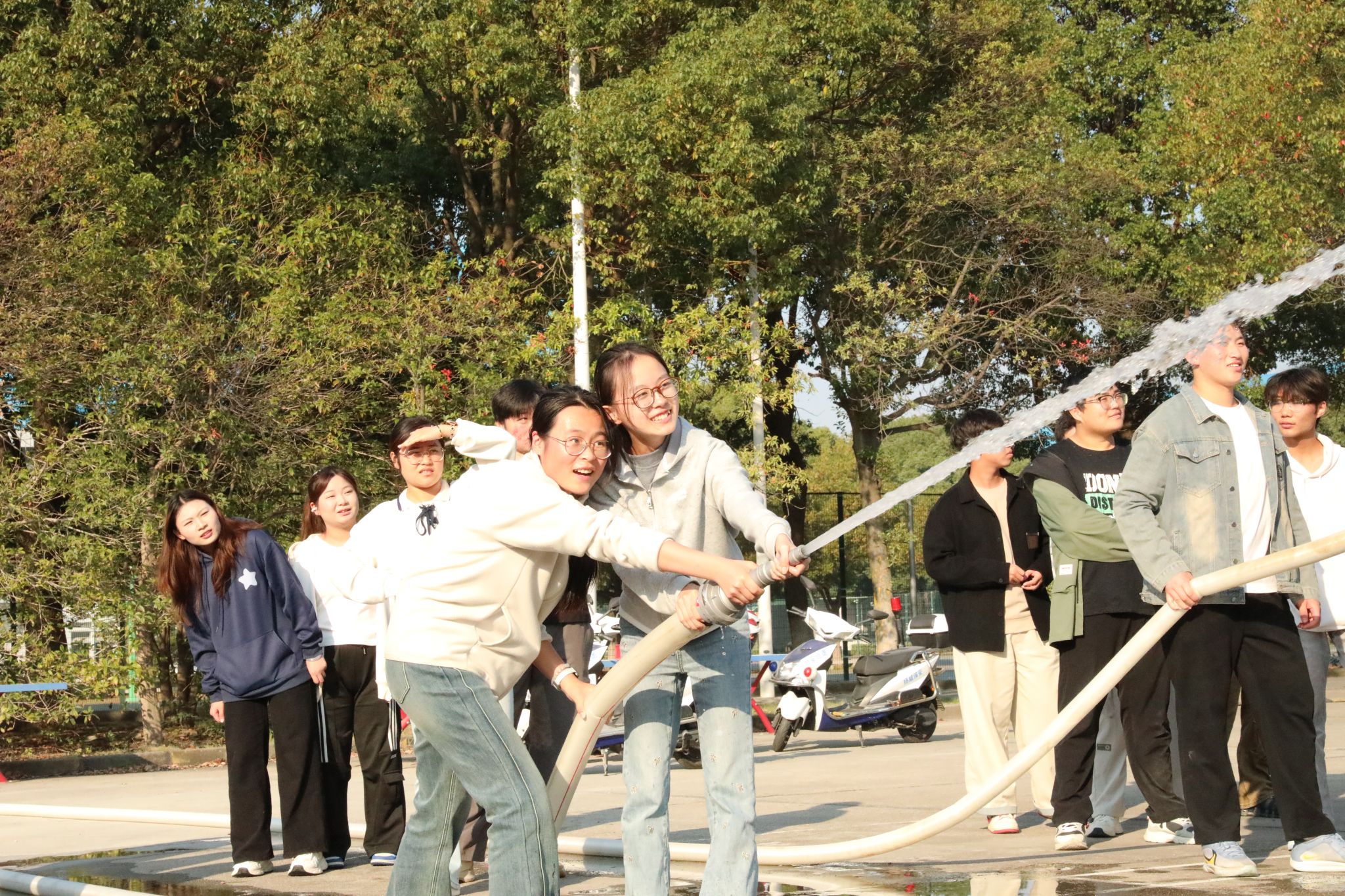 在随后的实操演练环节,师生们移步至指定空旷场地。保卫处专业指导老师现场演示干粉灭火器的规范使用步骤,即“提瓶、拔销、握管、压柄”四字诀,并讲解了操作要领。紧接着完整展示了消防栓的水带快速连接、阀门准确开启、水枪有效瞄准等一系列动作。在认真观摩后,全体参训师生分组依次上前,进行灭火器扑救初起火灾和消防栓出水操作的实战演练。