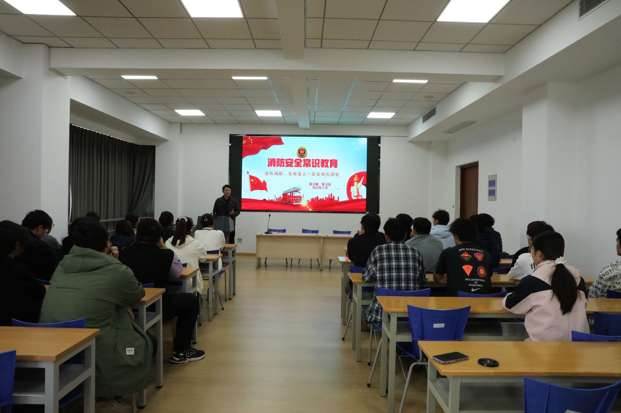 理论培训环节,保卫处杨楠老师结合高校特点,通过播放近年来国内外高校发生的典型火灾事故案例警示片,以触目惊心的真实画面,深刻揭示了火灾的巨大危害和“防患于未然”的极端重要性。针对集成电路学科的特殊性,杨楠重点剖析了实验室和科研场所中常见的火灾隐患,如电路短路、设备长时间过载运行、易燃易爆化学试剂存放不当、静电防护不足等,并给出了具体的排查要点和防范措施。他反复提醒师生,在日常学习与科研工作中,必须时刻保持警惕,严格遵守安全操作规程,坚决杜绝任何形式的违规操作,将安全隐患消灭在萌芽状态。