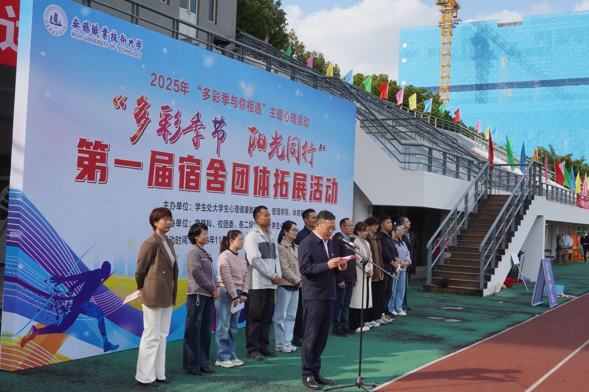 为深入推进学校“一站式”学生社区建设,增进宿舍成员间情感,提升学生身体素质和心理调适能力,11月11日下午,学校首届“多彩季节 阳光同行”宿舍团体拓展活动在学校体育场顺利举行。副校长储开峰出席开幕式,学生处、体育部等职能部门负责人、各二级学院分管学生工作领导、心理健康中心负责人及各学院心理辅导员参加开幕式。来自全校各院系的600余名学生参与此次活动。