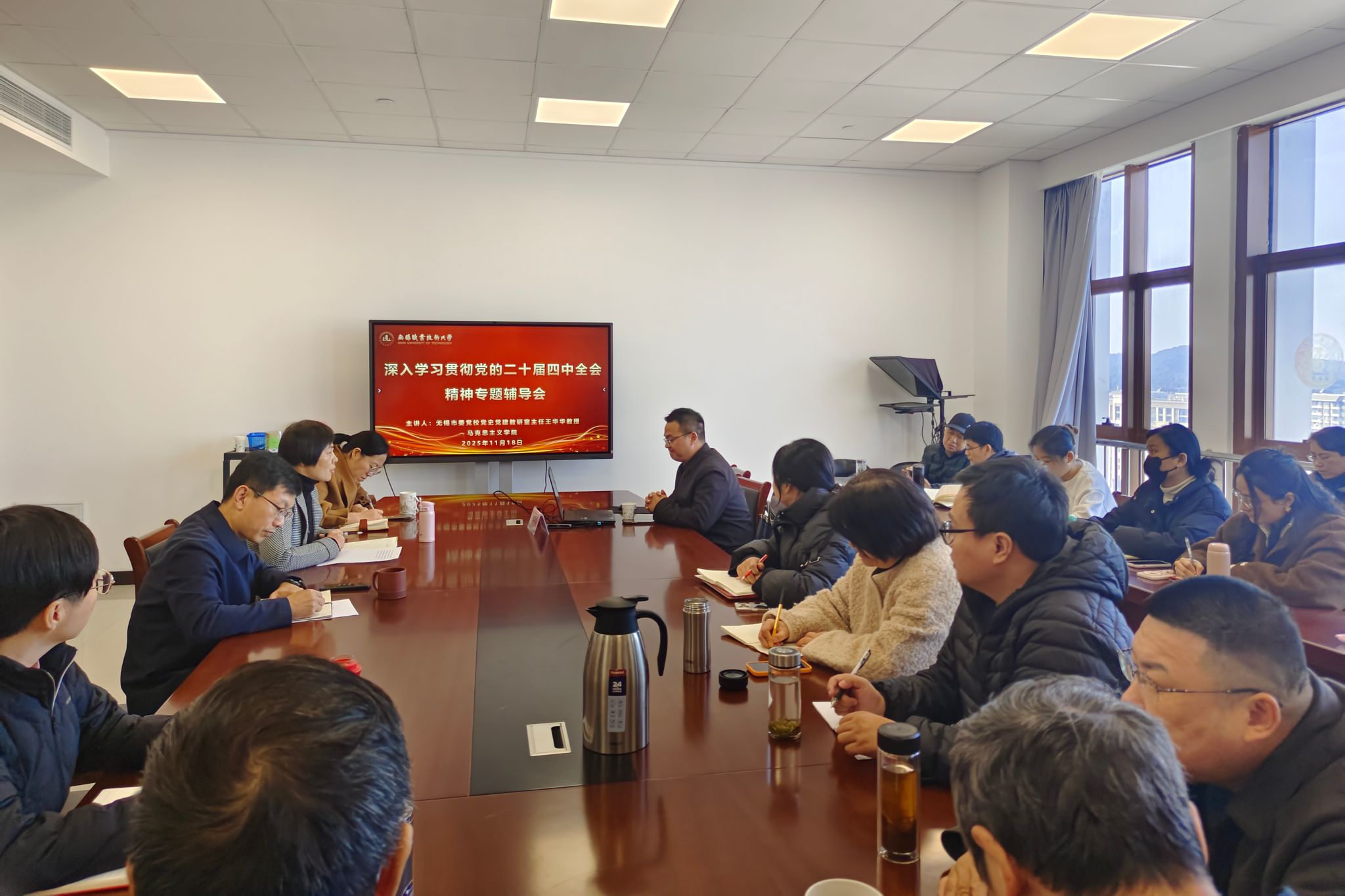 11月18日下午,马克思主义学院召开深入学习贯彻党的二十届四中全会精神专题辅导会,中共无锡市委党校党史党建教研室主任王华华教授应邀作主题宣讲,马院党总支书记赵后起主持会议,学院领导班子和全体教师参加会议。
