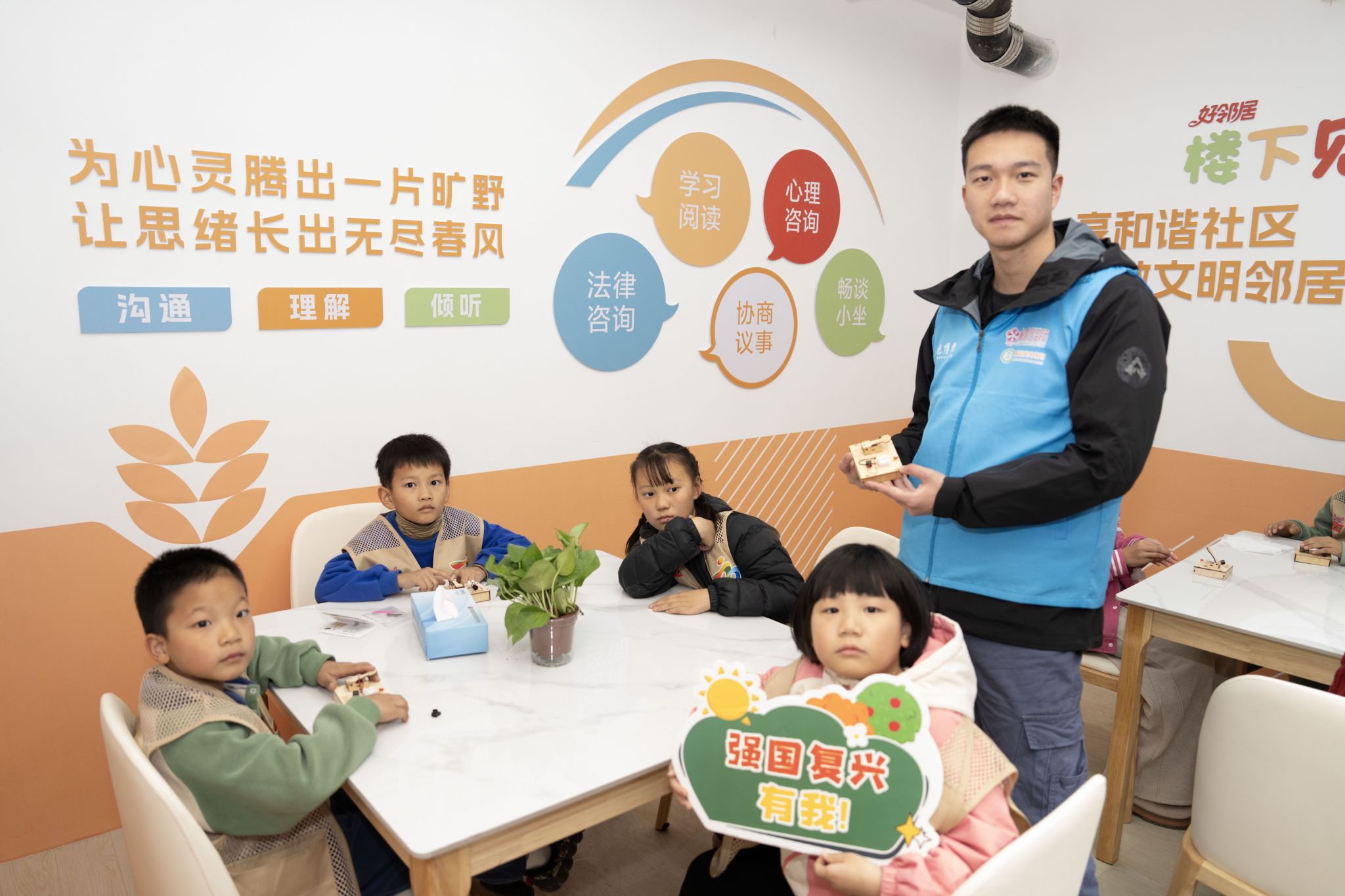 志愿者团队积极参与社区“三站式”活动,发挥机械学科特色助力各环节:第一站“小小量子科学家”环节,志愿者结合零件装配专业知识,协助青少年拆解手工作品结构,将“微观结构”与日常机械部件关联讲解,以通俗科普助小朋友掌握操作技巧、深化科学认知。第二站润心自习室中,志愿者化身“手作指导员”一对一辅导:协助内向学生互动协作,以工科思维优化作品细节,同时记录创作、分享的温馨瞬间,以严谨特质传递陪伴温情。第三站“幸福楼道”探访中,志愿者随社区“老娘舅”“楼组长”走访楼道,聆听建设理念与邻里暖事,践行“服务社区、践行责任”育人理念,助力社区文化氛围营造。社区工作人员表示:“志愿者带来的不仅是专业技能,更是青春视角的创新思维。”