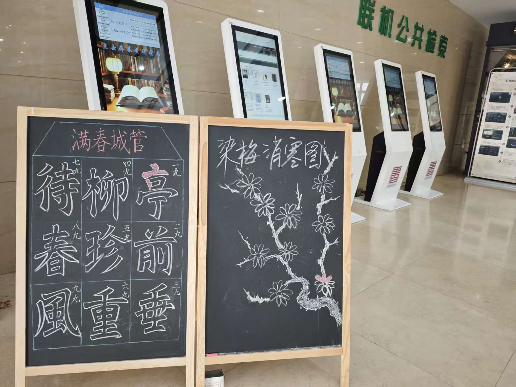 此次图书馆复原了两种经典形式:崔安芳老师书写的“管城消寒”与张敏老师绘制的“染梅消寒”。前者以“亭前垂柳珍重待春风”九个繁体字(每字九画)为载体,每日填实一笔;后者则绘有九朵梅花,每朵九瓣,每日染色一瓣。两种形式皆需坚持八十一日,直至“九尽春来”。小黑板下方放置粉笔,鼓励读者每日“填一笔”或“染一瓣”,共同期待春暖花开。