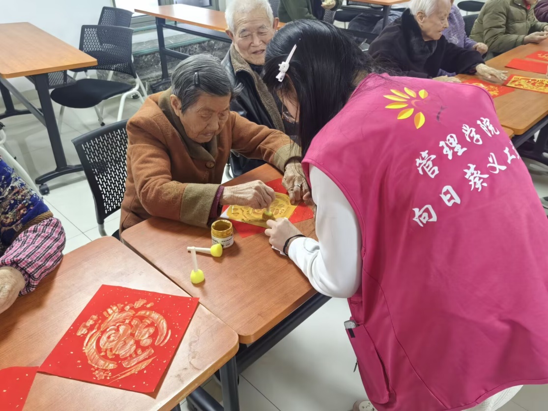 新春将至,年味渐浓。为传承中华优秀传统民俗文化,践行关爱老年群体的社会责任,1月15日下午,管理学院向日葵义工站师生志愿者走进新安养老服务中心,开展“‘银龄课堂’新春特辑|笔墨传情,青春送福”福字拓印活动,以传统技艺为载体,为老人们送上满满的新春暖意与美好祝福。