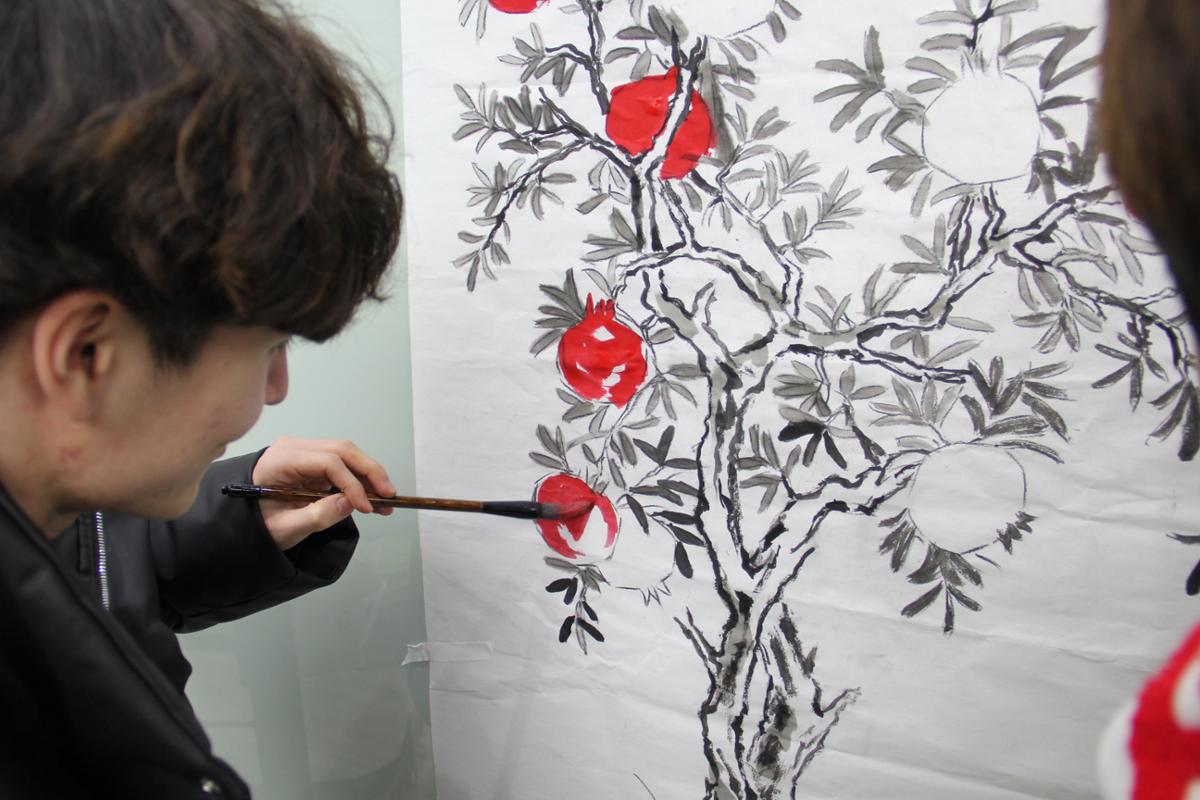 在绘制环节,各民族师生共同执笔绘就水墨石榴树。大家分工协作、默契配合,以坚实的笔触勾勒出石榴树粗壮的树干,象征着民族团结坚不可摧的稳固根基;维吾尔族、哈萨克族等少数民族同学将民族文化特色融入创作,或以细腻线条描绘繁茂枝叶,或以鲜明色彩渲染饱满石榴果,汉族同学则在旁积极配合,相互交流绘画技巧,彼此提供创意灵感。现场氛围热烈而和谐,历时一小时,两幅《水墨石榴树》跃然纸上,石榴籽紧紧相拥的模样,正是各民族师生手足相亲、守望相助的生动写照。