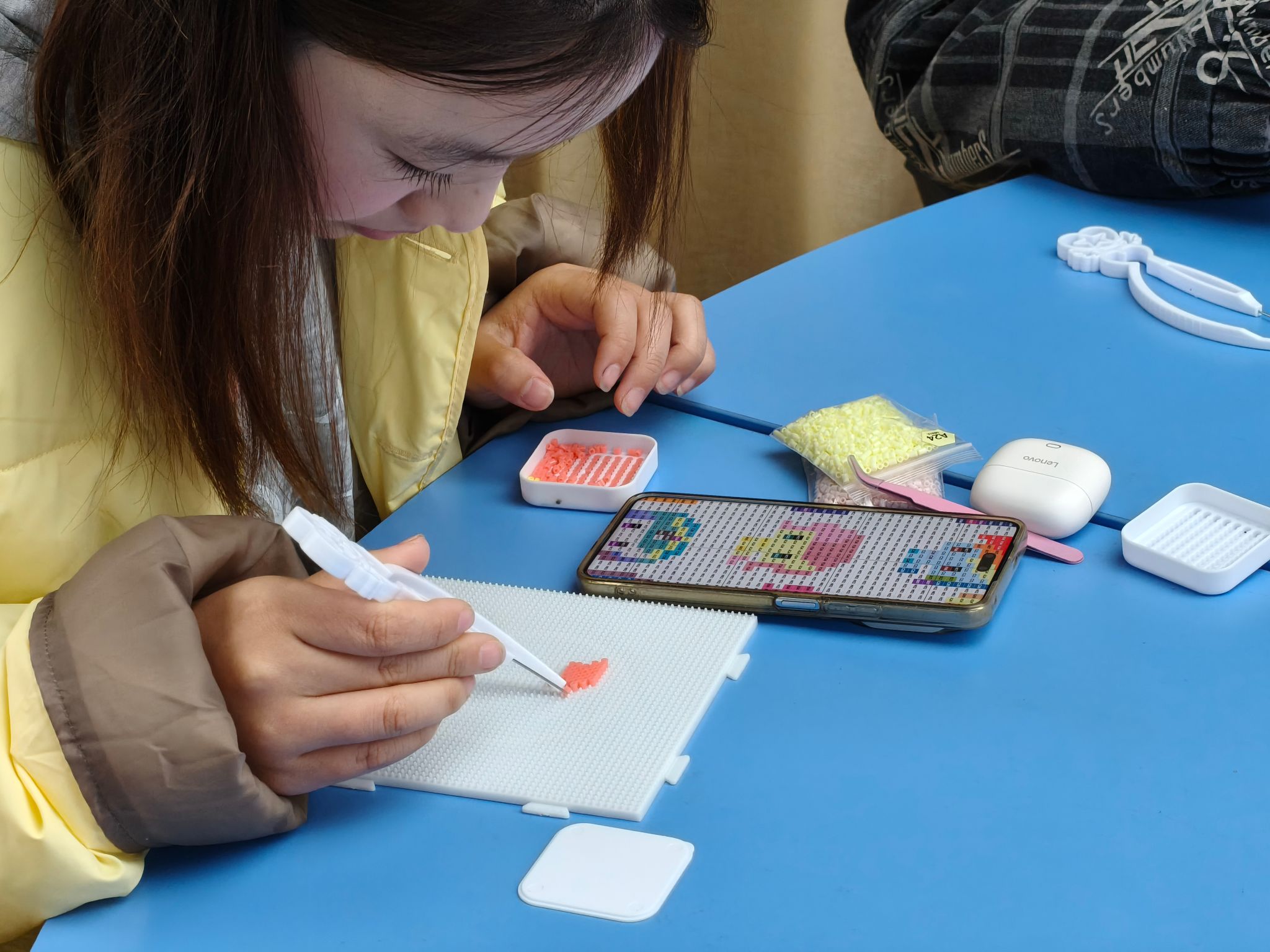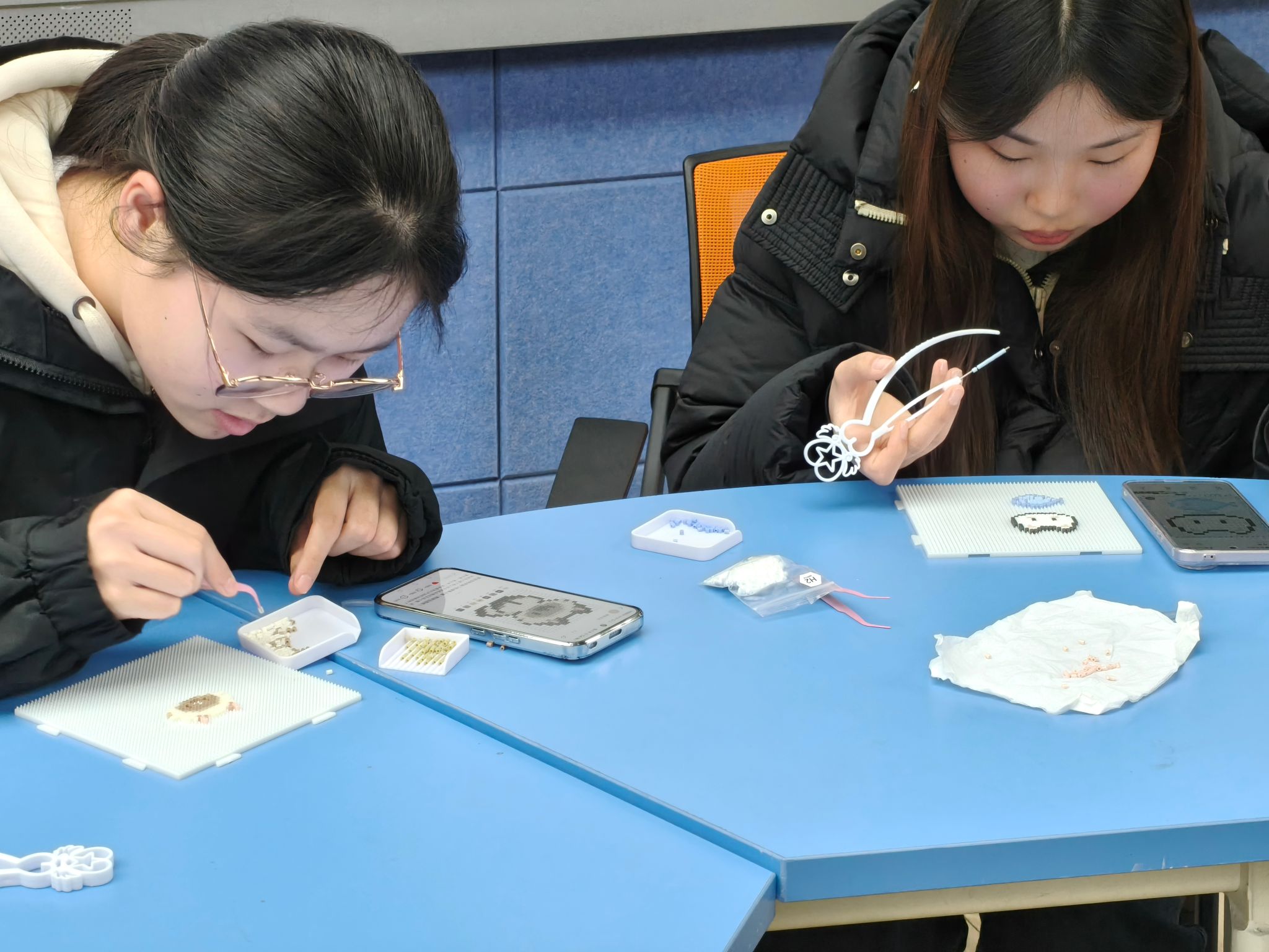 随着五彩拼豆在桌面展开,现场氛围逐渐沉静而专注。学生志愿者们穿梭于座位间贴心协助,熨烫区志愿者细心为每一件作品定型。既有个人沉浸创作的静谧时刻,也有相互欣赏交流的温暖互动。不少同学完成一件后意犹未尽,继续新的尝试;现场老师也加入其中,与学生共同完成一幅鲸鱼图案。活动渐近尾声,一件件拼豆作品被制作成小巧的钥匙扣和挂件,承载着创作者的心意与情感,被小心捧在手心。作品将陪伴同学们走向未来的学习与生活:一张笑脸提醒自己保持愉悦,一颗太阳为疲惫时分带来慰藉,一片色彩安放难以言说的情绪。