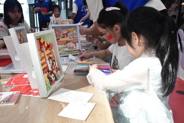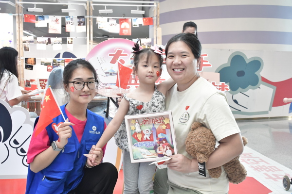 活动中,志愿者们邀请家长和孩子进到水滴商店,了解残友公益项目,制作手工作品。国庆将至,孩子们深受氛围感染,小手用心地拼贴,完成了一幅幅精美的画卷。“祝祖国母亲75周岁生日快乐!”孩子们与志愿者手拉着手,录制下为祖国华诞送上祝福的视频。“我是哈尔滨工业大学大一新生,我的愿望是通过自己的不懈钻研,打破国外对芯片材料的垄断!”一名青年掷地有声地说出自己的理想。志愿者还鼓励孩子们努力学习本领,未来一同为社会主义现代化强国建设做出贡献。