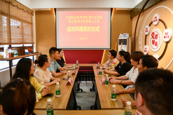 7月6日,爱尔兰学院党总支赴阳山桃文化残疾人之家,开展党建结对共建签约并于此挂牌了国际学生国情教育基地和志愿者服务基地,为今后的扶残助残和共建共享共商共赢奠定了良好的基础。阳山镇残联理事长俞丹萍、阳山村委党总支书记姚剑、残疾人之家负责人曹明玉、残疾人代表和我校爱尔兰学院党总支书记李湘、副院长孙台维、党员教师代表和学生代表参与了此次活动。