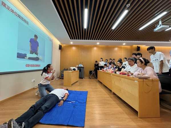 实操演练环节,各组指导老师逐一指导师生进行实践操作。大家认真学习,亲身体验各项基本操作流程及操作要领,做到人人上手,人人都会。 “看似简单的胸外按压和人工呼吸,操作起来并不简单,既要保证质量,又要保证速度。”培训中,不少师生如此感慨,同时希望自身能充分掌握急救技能,在今后遇到紧急突发的状况,能拿得出、救得活,最大限度地帮助急救人员抓住“黄金”救援时间,挽救生命。