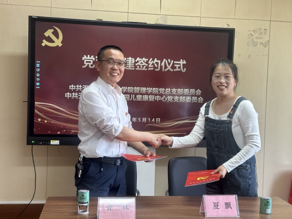 随后,管理学院党总支与无锡新吴区爱满园儿童康复中心支部签订党建共建协议、完成授牌,正式成为党建结对合作单位。