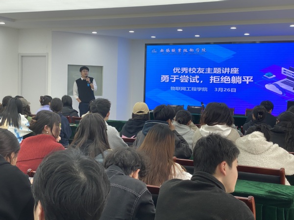 3月26日,物联网工程学院“母校有约”校友分享会在图C-401教室举行。2015届杰出校友曹高明作为主讲嘉宾,以“勇于尝试、拒绝躺平”为主题,为在场的同学们带来了一场生动而富有启发性的分享。