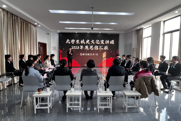 1月9日,外语与旅游学院在国教505开展大学生校史文化宣讲团2023年度总结汇报暨第七期标兵就位活动。校党委宣传部部长周春兰、团委副书记郑月圆、外语与旅游学院党总支书记郭再泉、副书记周嫄,大学生校史文化宣讲团指导老师及全体成员参加活动。