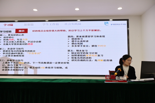分享会上,韩倩倩同学从“追梦,热爱,坚守,奉献”四个方面分享了在学习和生活中的感悟,她认为作为一名学生,扎实学识是第一要务,唯有掌握过硬的专业知识,才能成为未来社会应用型的人才;李和苗同学分享了她在日常生活方面的经验,合理安排时间,做到学习与生活的平衡;刘雪洋同学从学习和生活两个方面分享了她的心得体会,她提出优秀学生需要全面的素质发展,培养坚忍不拔的意志力和乐观向上的精神风貌;胡姝颖同学则向同学们介绍了专转本、江苏省和学校的相关资助政策以及医保使用等相关知识。