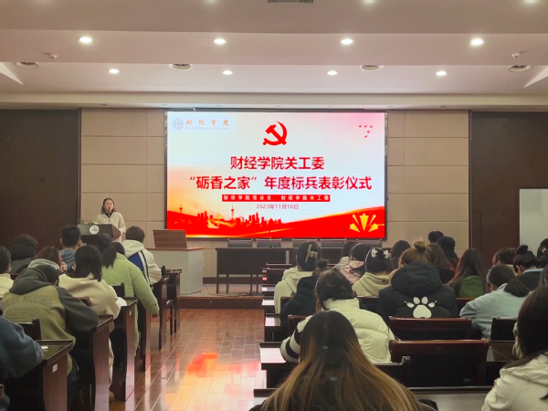 11月16日,财经学院党建品牌项目“经纬课堂”专题讲座暨关工委“砺香之家”年度标兵表彰仪式在国际交流中心二楼报告厅举行,财经学院相关负责人、关工委老师和70余名学生代表参加了本次讲座暨表彰仪式。