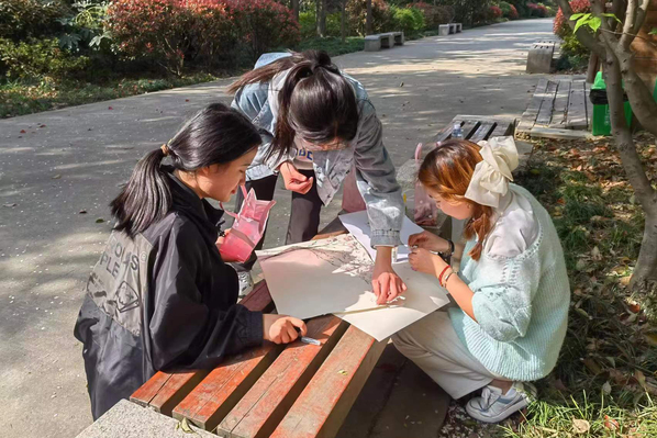 活动伊始,“乌鸦与乌贼”、“武松打虎”等破冰活动调动了现场同学们参与活动的积极性。随后,通过默契分小组,参与活动的同学分为不同的团队。同学们在团队中完成自我介绍和樱花创意画的设计工作。之后,同学们带着心中的樱花创意设计画走进长广溪公园,捡拾樱花花瓣和落叶,利用收集来的樱花瓣、树叶和树枝等制作樱花装饰画。团队同学相互配合、团结协作,认真细致地装点着作品,最终创作出属于各自团队就独一无二的樱花装饰画。