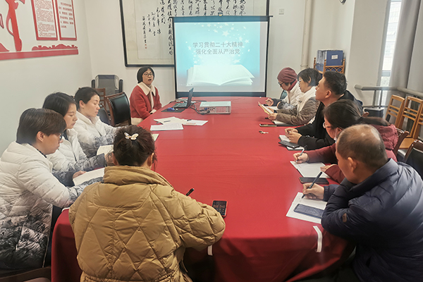 纪检委员罗雨舟作了题为《学习贯彻二十大精神 坚持全面从严治》的宣讲,重点围绕党的二十大报告第十五部分的内容,分三部分展开宣讲。一是以永远在路上、完善党的自我革命制度规范体系、以严的基调强化正风肃纪、坚持和加强党中央集中统一领导、永远吹冲锋号、打铁必须自身硬等六个关键词为主线,深入解读了党的二十大关于全面从严治党的精神内涵;二是以《踔厉奋发向未来·二十大精神在基层 以伟大自我革命引领伟大社会革命—学习各地贯彻落实党的二十大精神深入推进新时代党的建设观察》的新华社报道为例,讲述了全面从严治党在基层所取得的成效,诠释了全面从严治党的重大意义;三是传达了中共江苏省委《关于深入学习贯彻党的二十大精神在新征程上全面推进中国式现代化江苏新实践的决定》的精神,号召全体党员知行合一,坚定不移以党的自我革命引领社会革命。