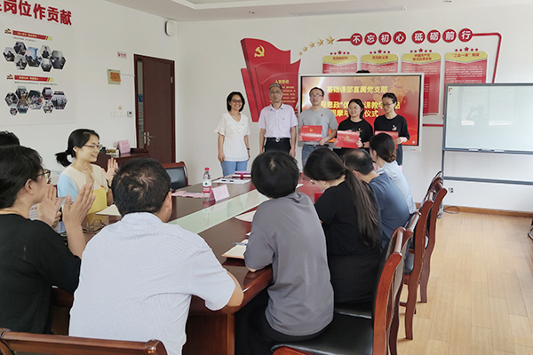 周桂瑾为获奖教师颁发奖状,表达了热烈的祝贺,同时也向积极参与的党员教师以及认真评审的教师表示了衷心的感谢。他指出,思想政治教育是做人的工作,解决的是“培养什么样的人”、“如何培养人”的问题,是我们党和国家的优良传统和各项工作的生命线。我们要认真落实立德树人根本任务,使各类课程与思想政治理论课同向同行、形成协同效应。