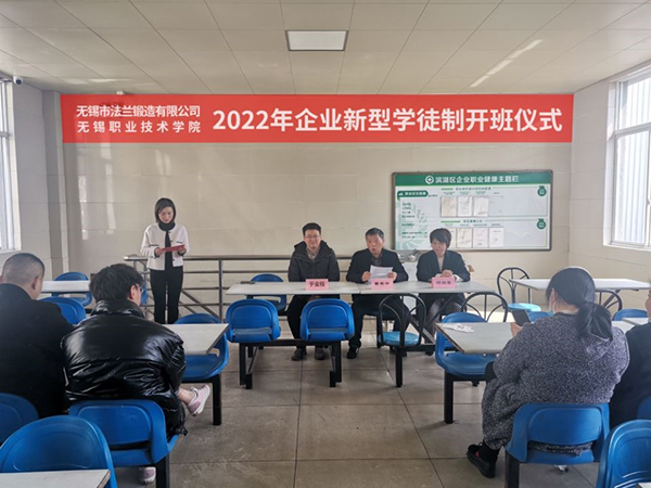 3月3日中午,我校与无锡市法兰锻造有限公司合作开展的企业新型学徒制数控车工中、高级培训班在公司举行,我校继续教育学院副院长曹秀中、机械技术学院副院长于金程、无锡市法兰锻造有限公司常务副总经理祁扬嵛、培训班企校导师、高级班26名和中级班50名学员参加开班仪式。