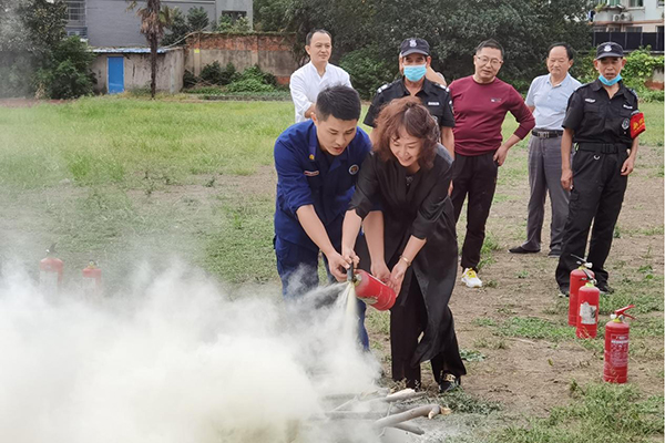 张寅结合真实案例生动讲解了火灾形势分析及火灾案例、电动自行车停放充电场所消防技术规范、消防法规等六个方面,向各位师生、员工及企业主演示了常用消防器材灭火器的使用方法,并组织培训人员逐一进行了灭火演练,进一步强化校企业人员“安全第一、生命至上”的消防安全意识。