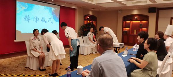 老师们参加了君来湖滨饭店举办的拜师仪式暨新员工欢迎会。拜师仪式由酒店人力资源部虞晓洁主持,实习生们给企业结对的行业导师行礼、奉茶,师傅还礼并与徒弟共同发表“互相尊重、共同努力”的宣言。拜师仪式简洁庄重,仪式感满满,实习生士气高涨。酒店方随后组织了温馨的欢迎仪式和趣味活动,让实习的同学有超强的集体归属感。