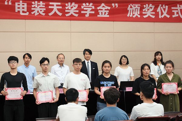 在颁奖仪式上,周陆飞书记代表学院致欢迎词,对电装天电子(无锡)有限公司的热心资助我校优秀学子的善行义举表示感谢,要求获奖同学们继续加强学习,提升专业技能,强化责任意识,懂得感恩,努力成为对社会有用的人。电装天电子(无锡)有限公司木下茂一总经理表示公司是一家有着强烈社会责任意识的企业,愿意积极资助优秀学生更好地完成学业,也希望有更多优秀的学生能加入电装天无锡公司这个大家庭,共享公司发展的成果。徐锋副书记代表学院宣读了2019年度电装天奖学金的表彰决定,学院和公司领导共同向获奖学生颁发了荣誉证书。之后,周峥嵘经理介绍了公司的主营业务和工作生活环境,鼓励同学积极选择公司作为自己的发展平台。学院2014届毕业生、电装天公司员工辛梦炜向在场的学习学妹们分享了自己在企业5年来的工作经历。获奖学生狄奕成代表全体受资助的同学对企业和学校为学生的成长发展所付出的努力表示感谢,自己会继续奋发学习,以优异的成绩回报社会。