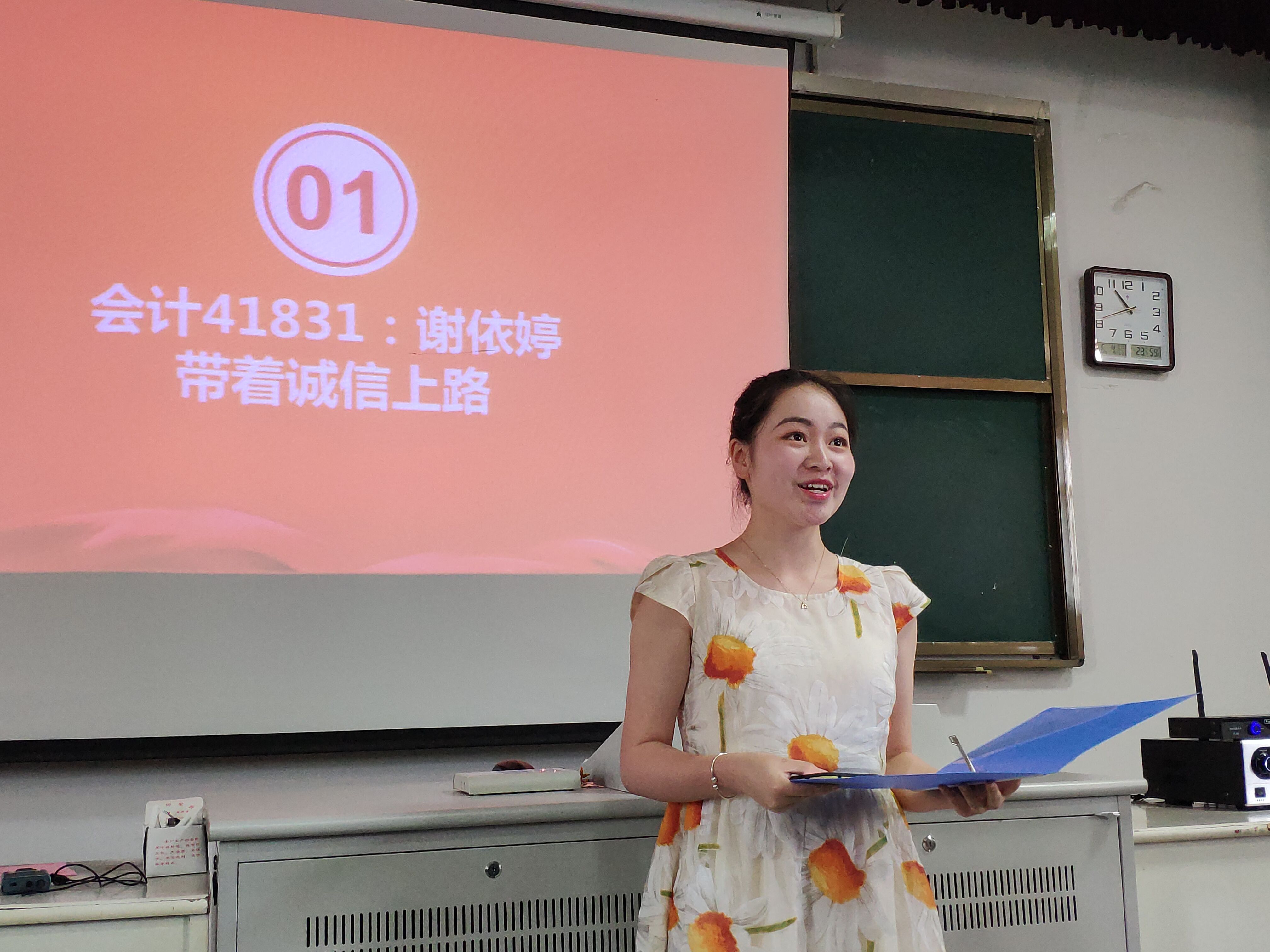 在一段悠扬的开场曲后,主持人介绍了本次活动的相关流程并依次介绍参赛规则和评委设置。随后,演讲者依次进行演讲,在演讲者讲述过程中,穿插了吉他弹唱等小环节,现场欢笑不断。同学们在欢乐中收获了诚信的知识,感受了诚信的魅力。“德不孤,必有邻”一个讲诚信、懂诚信的人,必将在人生路上走的稳健,走得踏实。